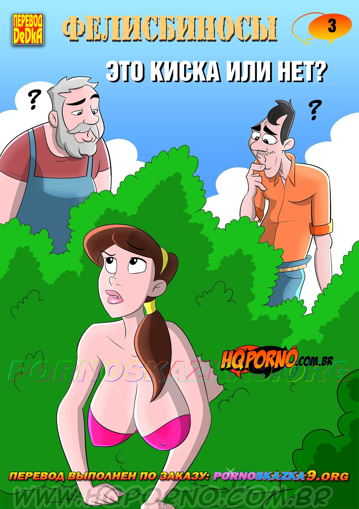 Порно комикс «Фелисбиносы. Часть 3. Это киска или нет?» Сеньор Фелисбинос и его работник, Нерсо, шли на рыбалку и увидели торчащую из кустов голую женскую задницу так, что была видна киска. Мужики глазам своим не поверили! Они понюхали, лизнули, попробовали и пальцами, и членами. Запах киски, вкус киски, внутри тепло и влажно, как в киске. Все сходится, это киска! Но Нерсо почему-то упорно твердил боссу, что что-то тут не так, это не киска… В чаем же дело?